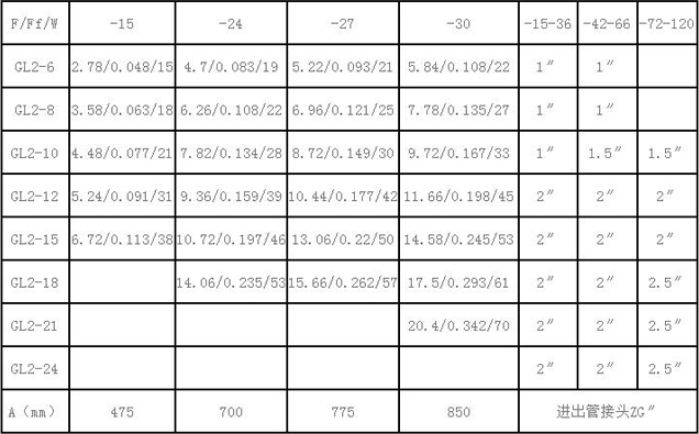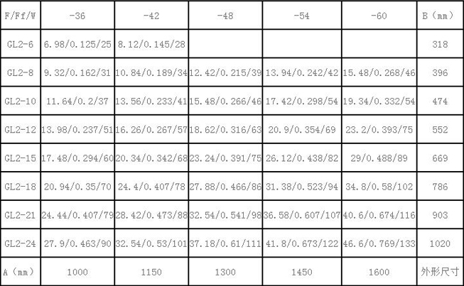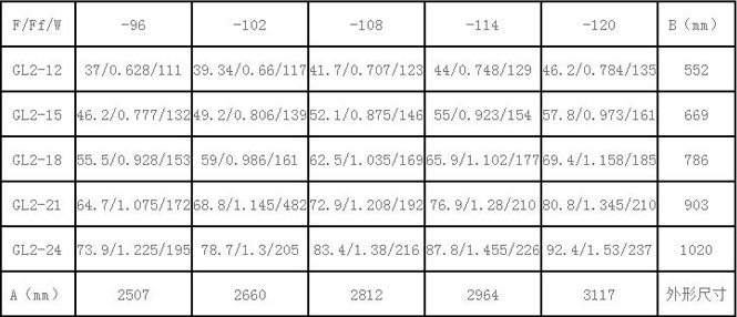 GLⅡ散熱器散熱面積F(m2)、通風凈截面積Ff(m2)、參考重量W(Kg)、安裝尺寸等一覽表