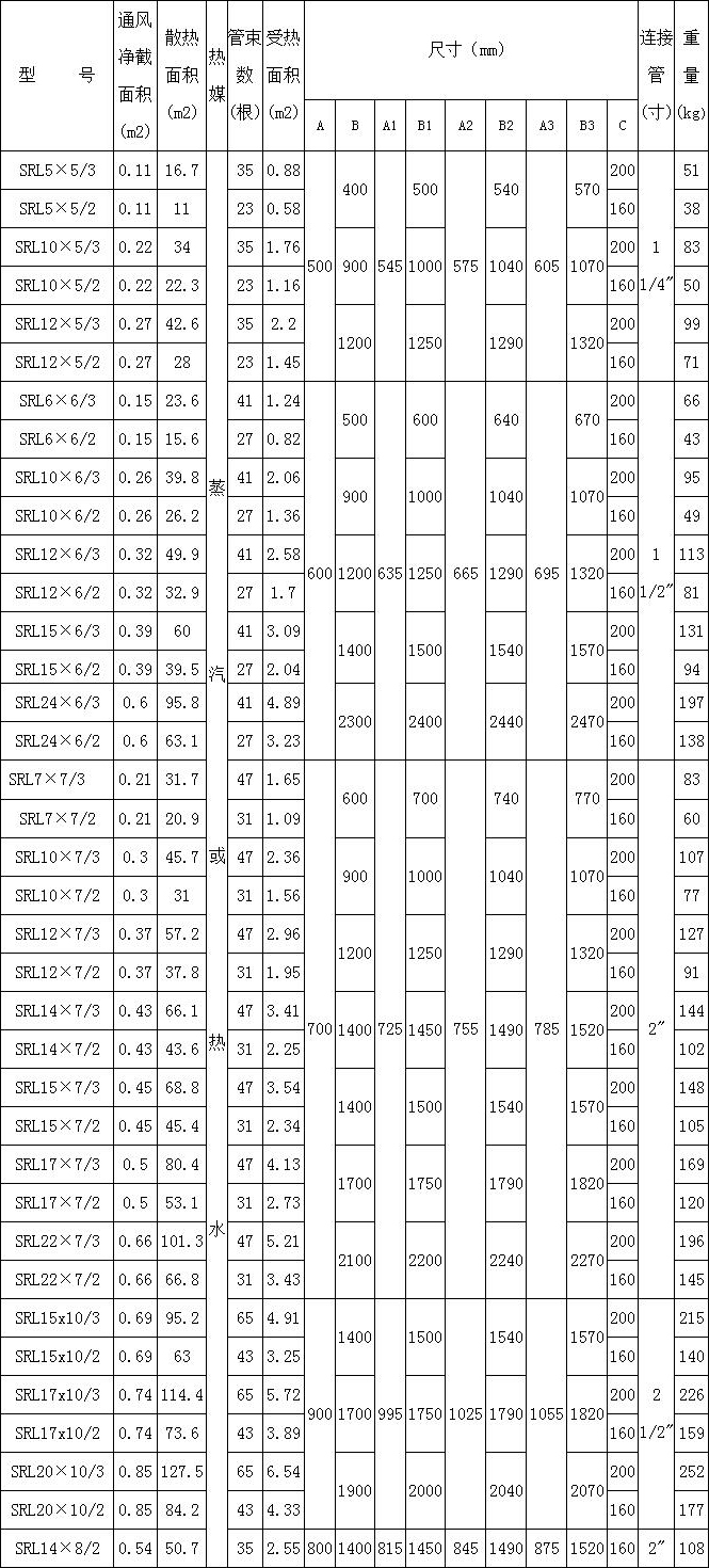 表二、SRL散熱器散熱面積F(m2)、通風凈截面積Ff(m2)、參考重量W(Kg)、安裝尺寸等一覽表